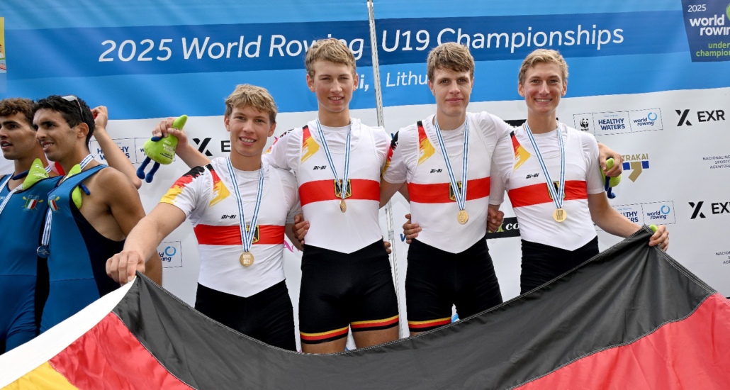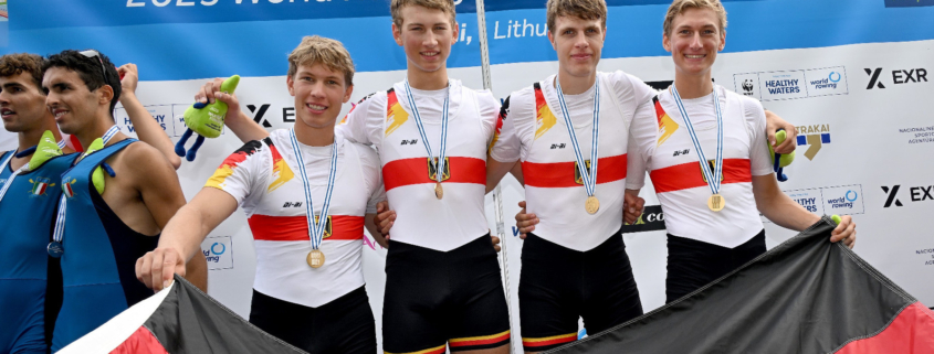 In der gleichen Bootsklasse bei den Junioren hatten die Italiener den schnellsten Start, wurden aber bereits auf den zweiten 500 Metern vom deutschen Doppelvierer mit dem Kieler Miklas Scheer eingefangen. Als drittes Boot mischte sich der Schweizer Doppelvierer in den Medaillenkampf ein. Auf der zweiten Streckenhälfte konnte Miklas und sein Team ihren Vorsprung souverän ausbauen. Auf Höhe der Tribüne war deutlich Wasser zwischen den Deutschen und den folgenden Italienern, an dritter Position die Schweizer. Starke Performance der vier deutschen Skuller, die unangefochten die zweite Goldmedaille für den DRV einfuhren!